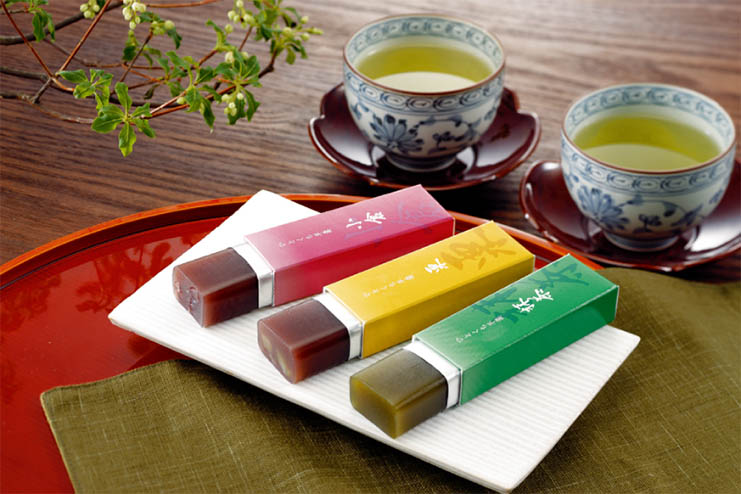 5種類の味が楽しめる老舗「なごみの米屋」のひとくち羊羹、静岡深蒸し煎茶を組み合わせました。